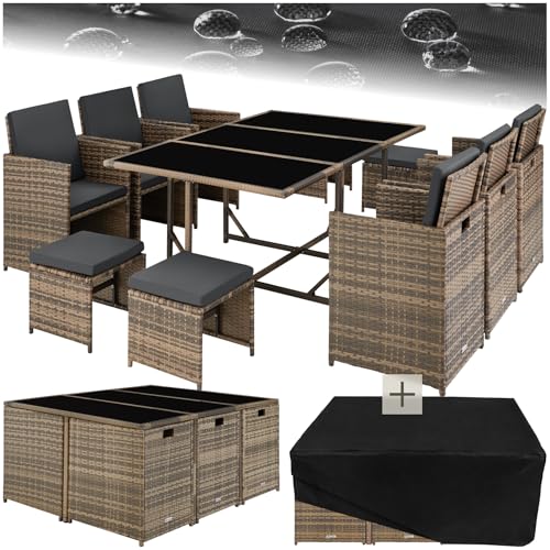 TecTake® Salon de Jardin Exterieur en Résine Tressée Poly Rotin Salon de Jardin Table 10 Personnes 6 Fauteuil en rotin 4 Tabouret Pouf Encastrable avec Housse de Protection, Entretien Facile