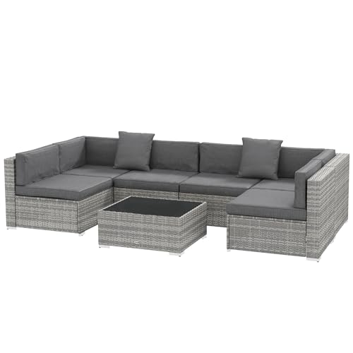 Outsunny Ensemble Salon de Jardin 7 pièces modulables, Coussins déhoussables Inclus, Table Basse avec Plateau Verre trempé, en résine tressée, Gris