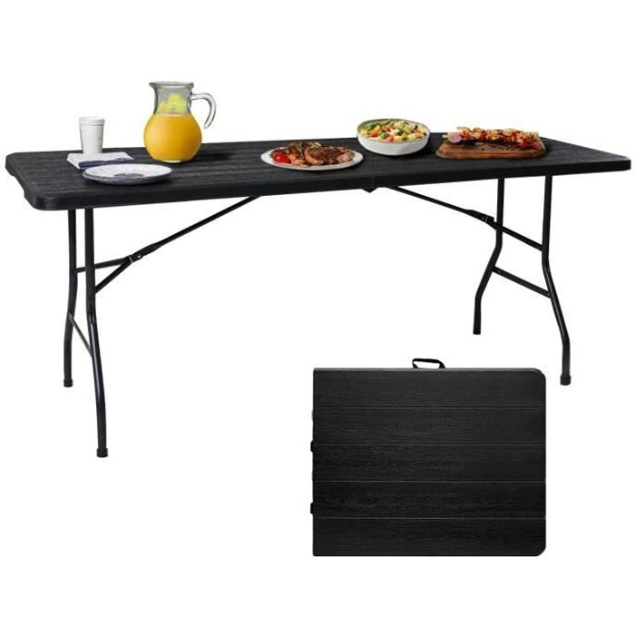 RONDY Table Pliante Noir - Table de Jardin - Table Pliante de Camping - Imitation Bois - Capacité 8 Personnes - poignée de Transport