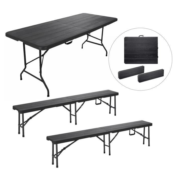 vounot® Ensemble Table Pliante et Bancs Pliables Camping 180cm HDPE Style Polyrotin 8 Places Fonction Portable Convient pour la Terrasse, Le Camping, Le Jardin, Table de Pique-Nique Noir