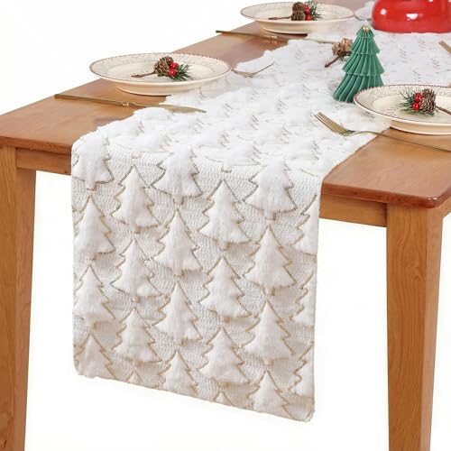 Chemin de Table Noel, 35x180 cm Peluche Blanche à Paillettes Arbre de Noël Modèle pour Fête Décoration Intérieure et Extérieure d'hiver