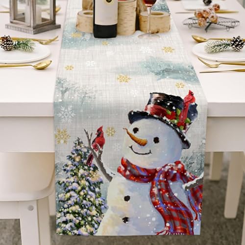 Chemin de Table Noël, Décoration de Table, Deco Table Noel Flocons de Neige Chemin de Table en Lin, Décoration Saisonnière Intérieur, Vacances, 183 x 33cm (Bonhomme de Neige, 33X183cm)