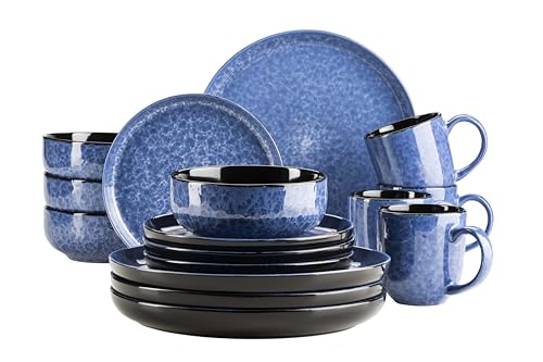 MÄSER 934109 Série Filippa Service de table en céramique pour 4 personnes, ensemble de vaisselle combinée moderne de 16 pièces ; assiettes, bols et gobelets avec vernis réactif en bleu et noir, grès,