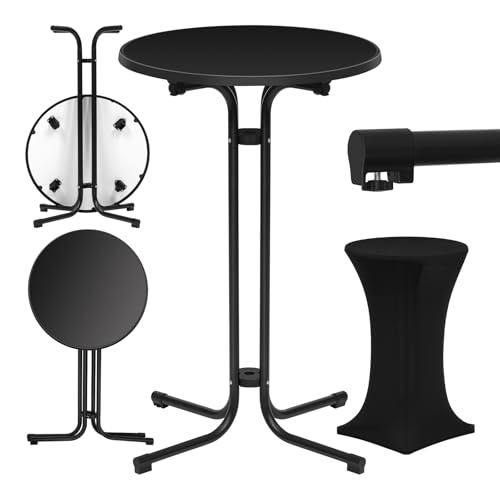 WOLTU Table de Bar Ronde et Haute, Mange Debout Extérieur à Cadre en Métal, avec Housse Élastique et Plateau Pliant en Bois d'Ingénierie, Ф70 x 110cm, Noir Mat