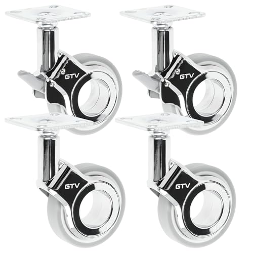 GTV Gira Lot de 2 roulettes pour meubles avec frein + 2 roues de meubles sans frein, chromé/gris mat, pivotantes à 360°, pour bureau, étagère, table basse, tabouret, diamètre 60 mm, hauteur 94 mm