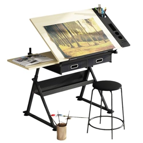 Table à dessin inclinable hauteur réglable avec tabouret et 2 tiroirs compartiments à crayons bureau