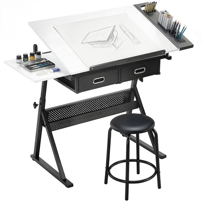 Table à dessin inclinable hauteur réglable avec tabouret et 2 tiroirs compartiments à crayons bureau