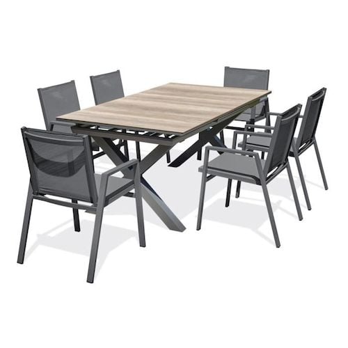 Ensemble Table de Jardin Extensible Imitation Bois & 6 Fauteuils Floride 180-240cm Gris Anthracite
