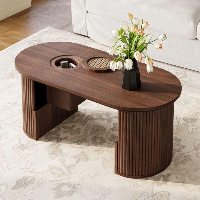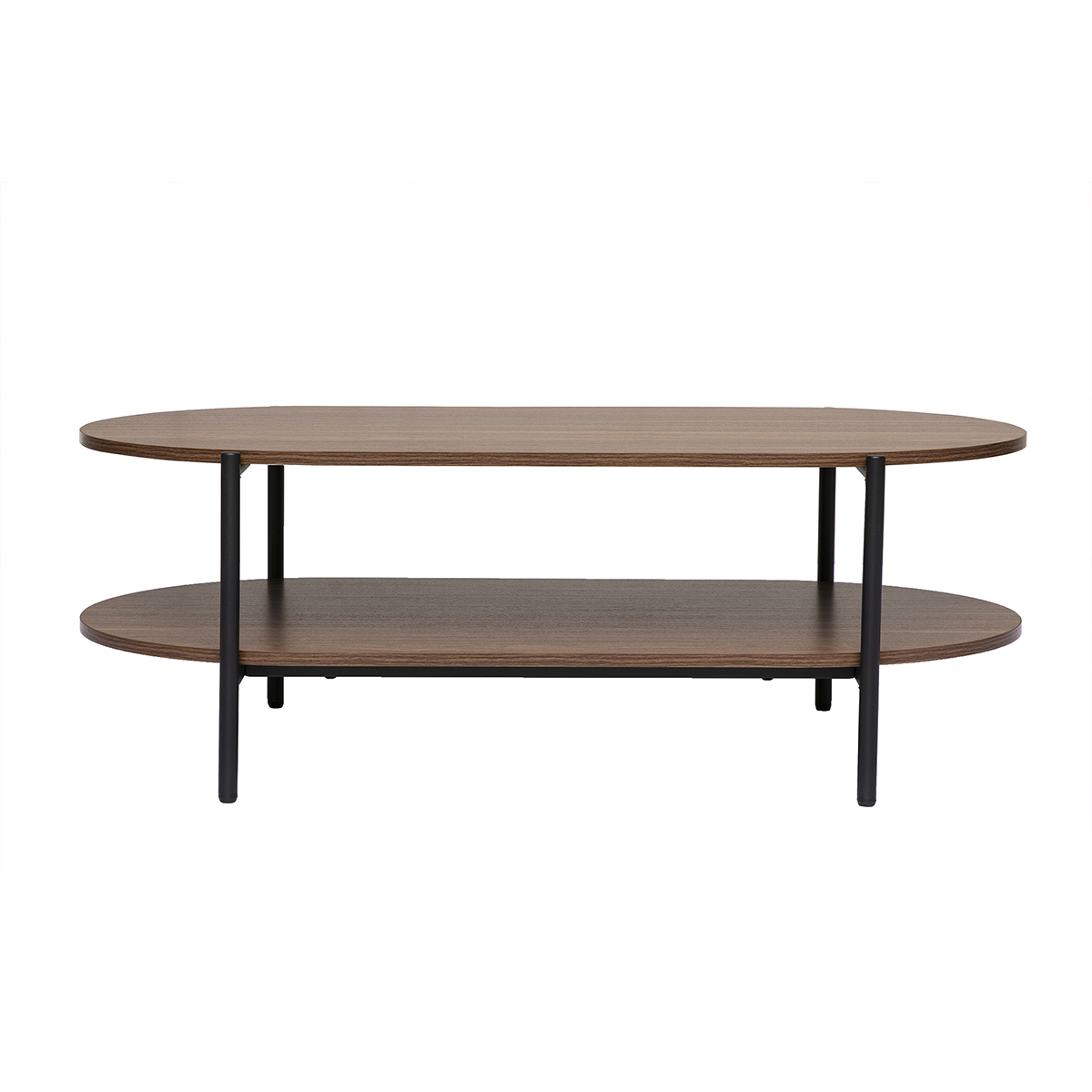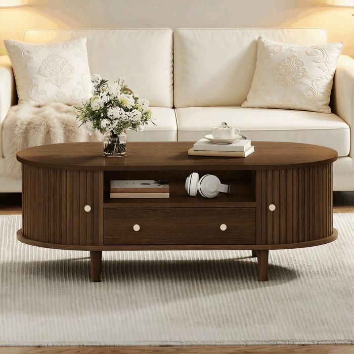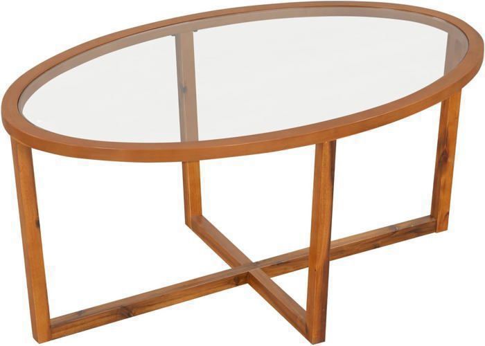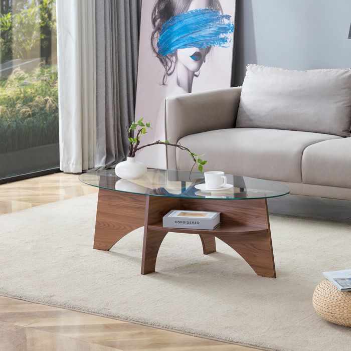 Table basse ovale en verre - 1049x60 cm - Verre de sécurité - Cadre couleur noyer - Étagère intégrée