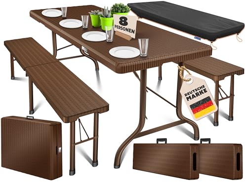 KESSER® Ensemble de Tente à bière, Set de 3 pièces : Table + 2 bancs, pour l'intérieur et l'extérieur, Pliable, avec poignées de Transport, Plastique, Aspect rotin | Meubles de Jardin, Marron