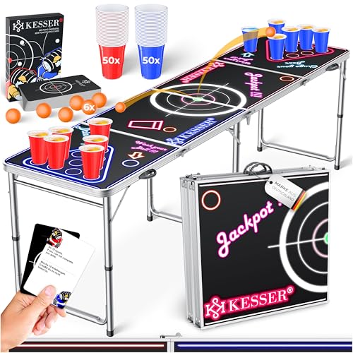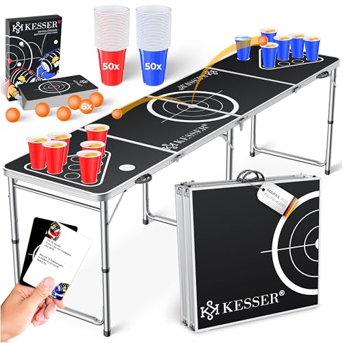 KESSER® Beer Pong Set de table avec jeu de cartes à boire – Avec 100 gobelets (50 rouges et 50 bleus), 6 balles + règles Jeux de fête Table réglable en hauteur pliable
