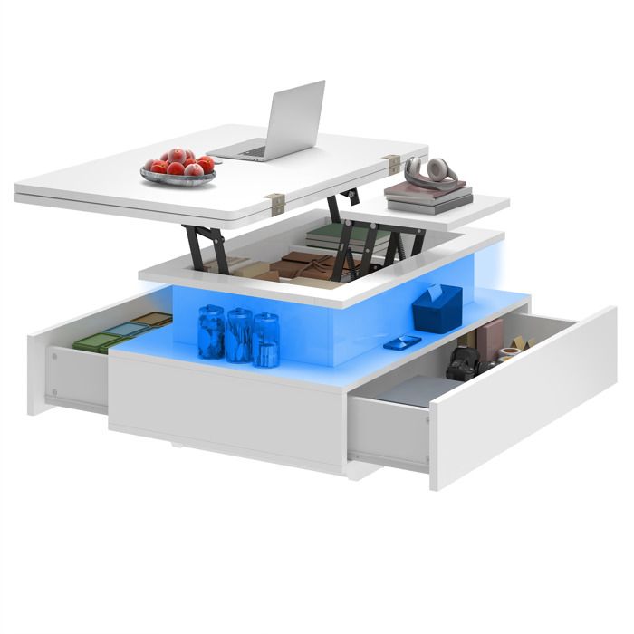 Table basse Balconera à hauteur réglable - Table basse extensible 4 en 1 - avec guirlande lumineuse LED et 2 tiroirs-Blanc