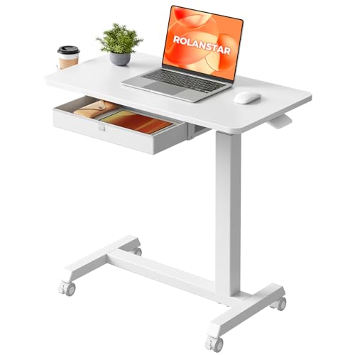 Rolanstar Petit Bureau Mobile Réglable en Hauteur 72-106 cm - Table d’Appoint de Canapé/Chevet avec Tiroir et Porte-Gobelet, Plateau 68x40 cm - Bureau de Travail pour Salon, Chambre, Balcon, Blanc