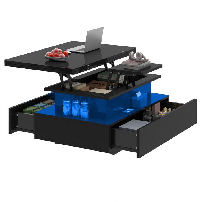 Table basse Balconera à hauteur réglable - Table basse extensible 4 en 1 - avec guirlande lumineuse LED et 2 tiroirs-Noir