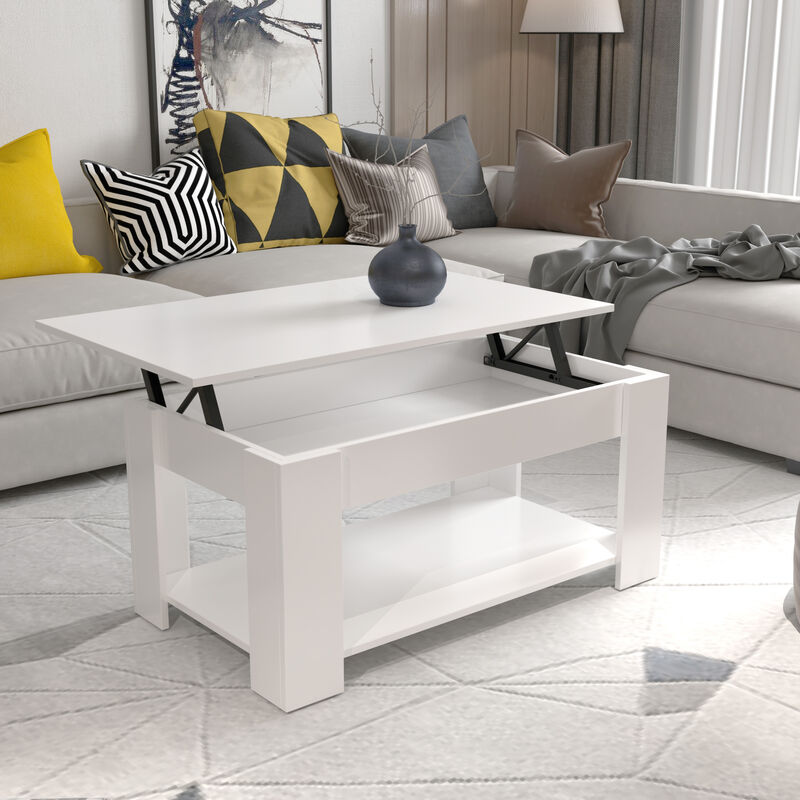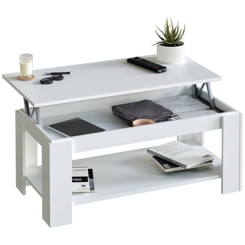 Table basse avec Plateau Relevable Table de salon Moderne avec Etagère de Rangement Compartiment Caché pour Salon Bureau 98 x 50 x 42 cm Blanc