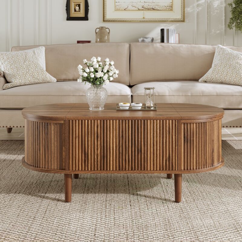 Table Basse Relevable Ovale avec 2 Portes Coulissantes et Étagères Ouvertes, Style Moderne Rétro, en MDF, 100×50×40,5 cm, Noyer