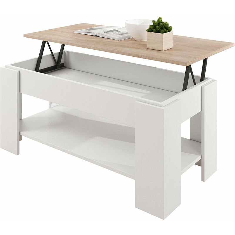 Muebles Bonitos - Table basse plateau relevable avec coffre 100x50x43,5 (52,3)cm Modèle Nicoleta Blanc et Sonoma Finition brillante