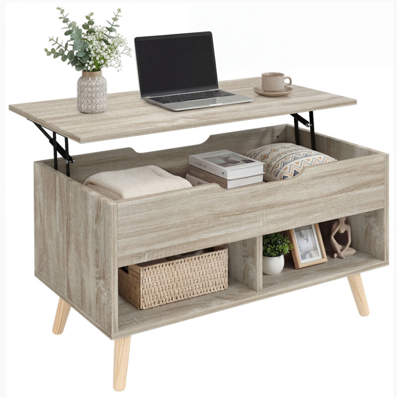 Table basse relevable ovale avec rangement, 100x48x53,5 cm, style vintage, pieds en bois massif, meuble multifonction pour salon - Couleur chêne