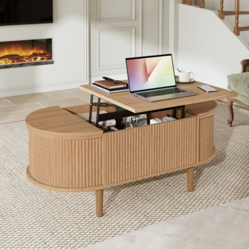 Table Basse Relevable Ovale avec 2 Portes Coulissantes et Étagères Ouvertes, Style Moderne Rétro, en MDF, 100×50×40,5 cm, Chêne