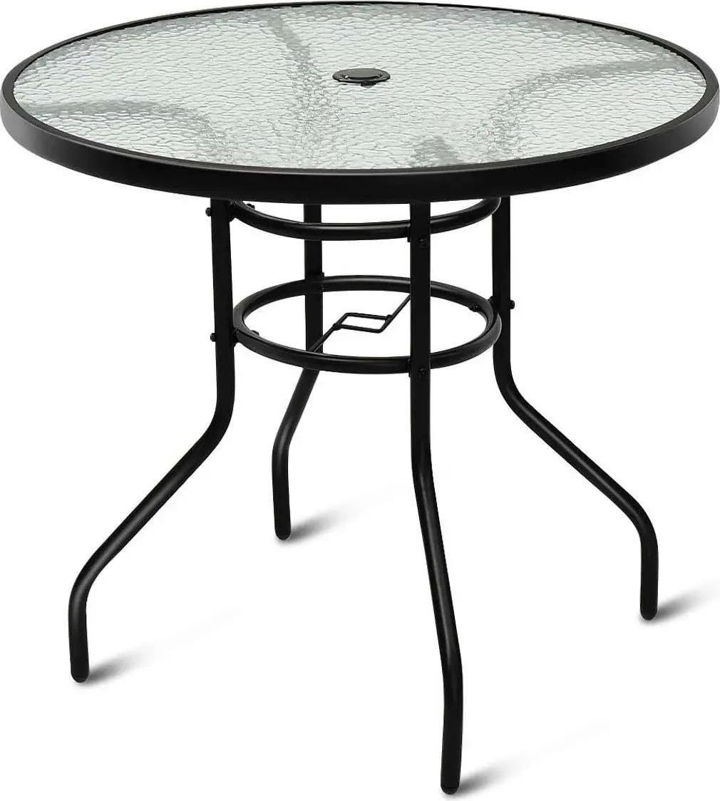 Table de jardin - Table ronde pour balcon et terrasse - Trou pour parasol - Plateau en verre trempé - Structure métallique - 80 x 80 x 71 cm - Noir