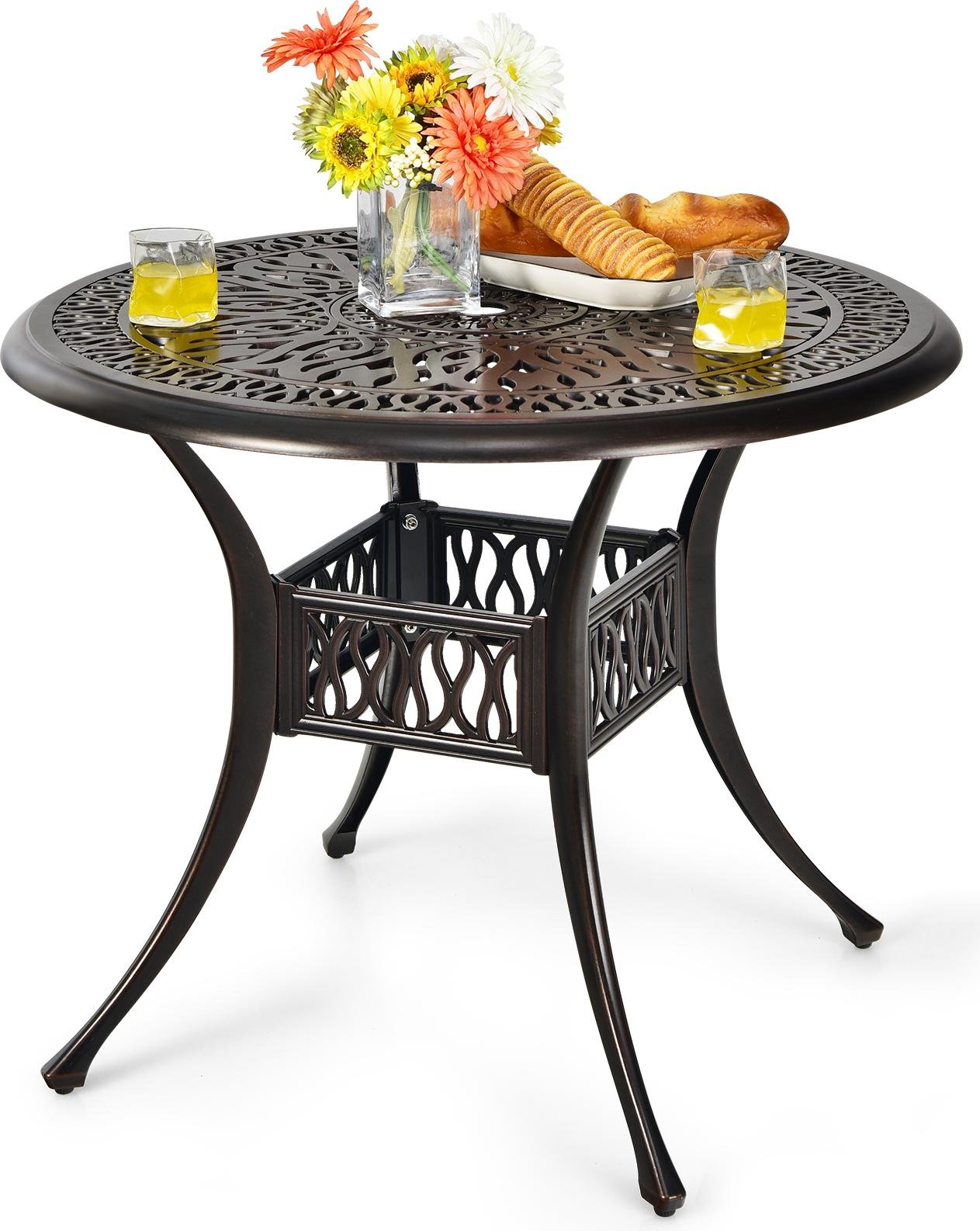 COSTWAY Table de jardin avec trou pour parasol, Ø90x72cm table ronde de balcon en fonte d'aluminium, table de terrasse résistante aux intempéries, aspect antique