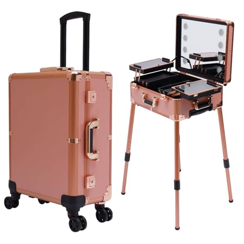 PUDLOR Valise à roulettes, organiseur de maquillage cosmétique de voyage, organiseur cosmétique train table 8 lumières LED avec luminosité réglable, équipée d'une serrure et d'une poignée extensible