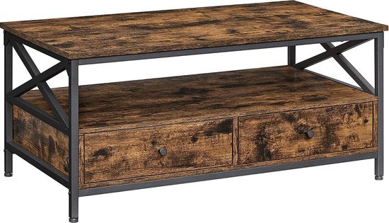 VASAGLE table basse, table de salon avec tiroirs, 100 x 55 x 45 cm, table basse pour salon, tréteaux en X étagère ouverte design industriel,
