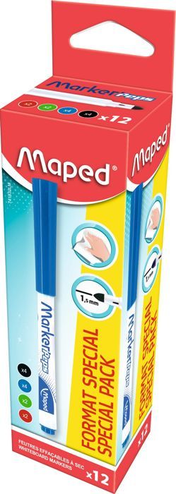 Feutre à tableau blanc - MAPED - Marker Peps - Pack de 12 - Couleurs Noir Bleu Vert Rouge - Pointe ogive