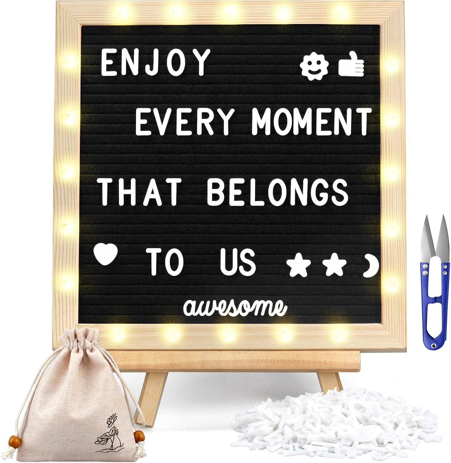 Lewondr Tableau à Lettres en Feutre, 10 X 10 Tableau à Message Interchangeable en Bois, Tableau à Messages Modifiable avec 20 Lumières LED&340 Lettres, Tableau de Messages Alphabétique, Coloré
