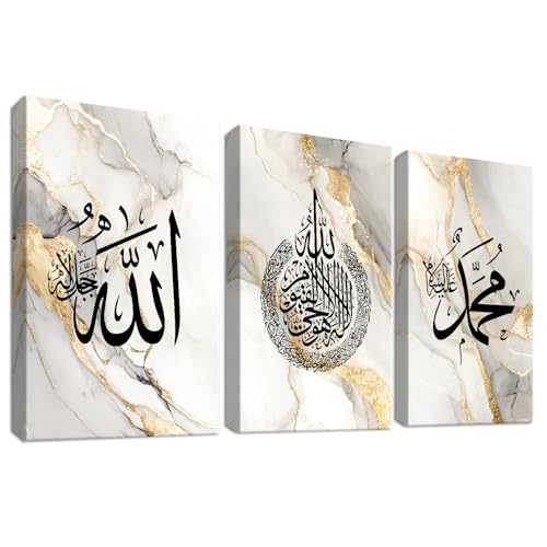 Set of 3 Cadre en Bois Impression sur Toile Musulman Gris Blanc Or Marbre Tableau Image sur Toile Calligraphie islamique arabe Ayat Al Kursi Tableau Decoration Murale Salon Chambre 30x40cm x 3pcs