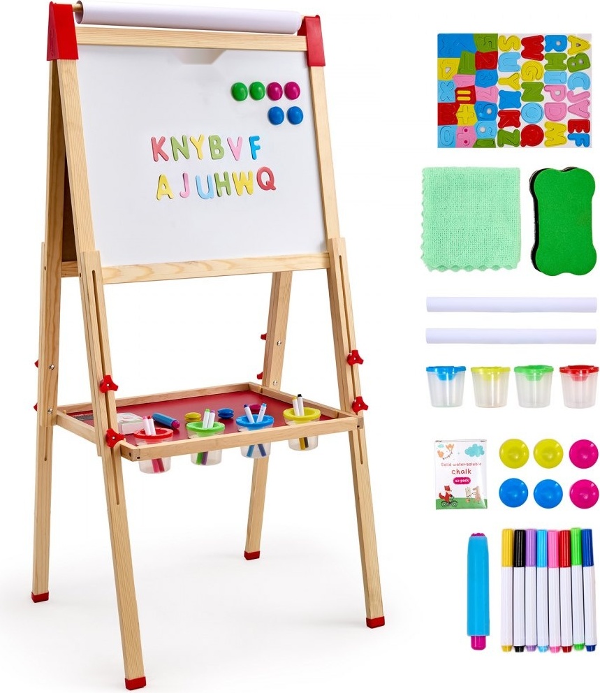 Chevalet Enfant Double Face en Bois avec Rouleau à Papier - Tableau Blanc & Noir Réglable - Cadeau Anniversaire Fille Garçon (Accessoires Inclus)