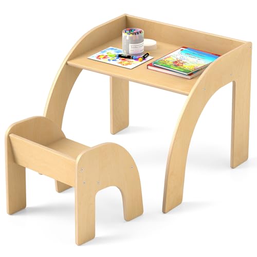 GOPLUS Table Enfant avec Chaise, Bureau Enfant en Bois avec Chaise Ergonomique, Plateau Large, Petit Table d'Activités pour Manger, Dessiner, Lire, Meuble de Chambre d'enfant (Naturel)