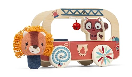 LILLIPUTIENS - Jack Le Lion - Camion d'activités en Bois - Pompier - Personnage en Tissus - Multicolore - 21 cm - Dès 12 Mois - 83892