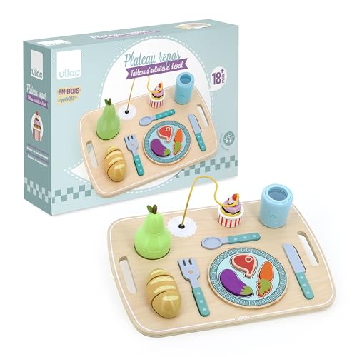 VILAC - Plateau Repas Tableau d'activités et d'éveil - Jouet Premier Age - 1 Plateau Repas Multi-activités en Bois - en Bois - Dès 18 Mois - 8128