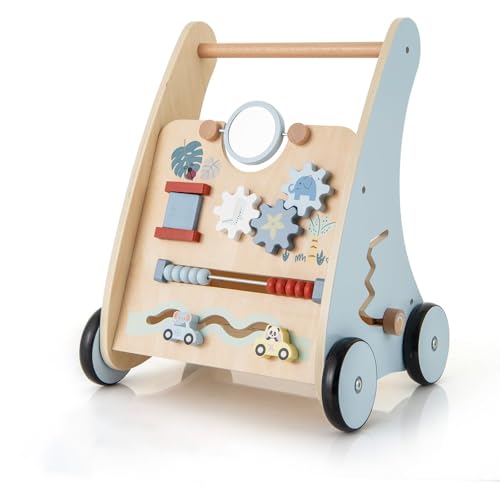 GOPLUS 8 en 1 Trotteur Bébé Garçon Fille, Chariot de Marche Bebe Montessori avec Roues, Espace de Rangement, Centre d'Activités à Pousser et à Tirer, Trotteur en Bois pour 1+ Ans (Bleu)