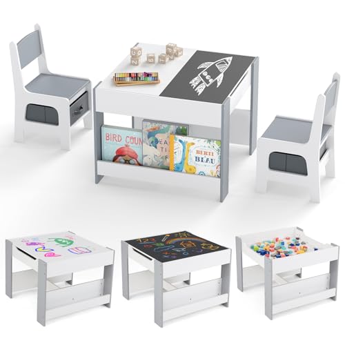 GOPLUS Table Enfant avec 2 Chaises, Table d'Activités pour 3-6 Ans avec Tableau Noir Double Face Amovible, Petit Bureau Enfant avec Rangement, 2 Étagères et 2 Bacs en Tissu (Gris)