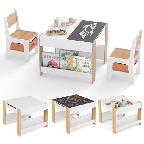 GOPLUS Table Enfant avec 2 Chaises, Table d'Activités pour 3-6 Ans avec Tableau Noir Double Face Amovible, Petit Bureau Enfant avec Rangement, 2 Étagères et 2 Bacs en Tissu (Naturel)