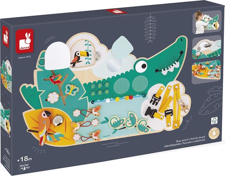 Janod - Busy Board Croco - Panneau d'Activités - Thème Animaux de la Jungle - 14 Activités - Jouet Enfant pour Garcon Fille - Développe la Motricité Fine - Jouet en Bois FSCTM - Dès 18 Mois - J08280