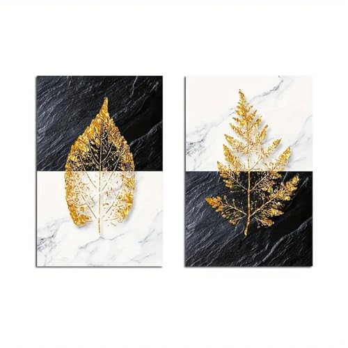 CWBLYZ 2 Pièces-Affiche Imprimée sur Toile Motif Marbré Noir et Blanc à Feuilles Dorées Tableau Végétal Décoratif pour Salon Chambre Bureau et Intérieur-50 * 70cm (non encadré)