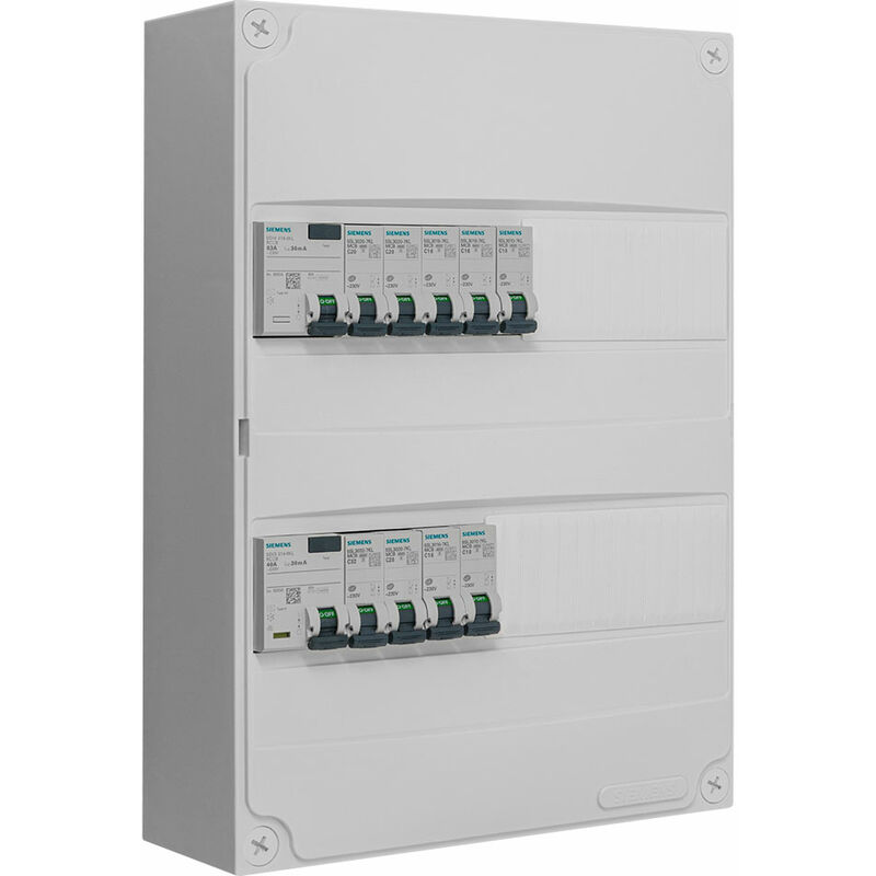 Siemens – Tableau électrique pré-équipé 2 rangées – 2 interrupteurs différentiels 40A – 6 disjoncteurs 10A/16A/20A/32A – IP30 IK05