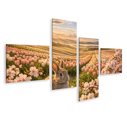 islandburner Tableau sur toile Éveil du printemps : Lapin dans un champ de tulipes en fleurs - 4 pièces - Edition I1