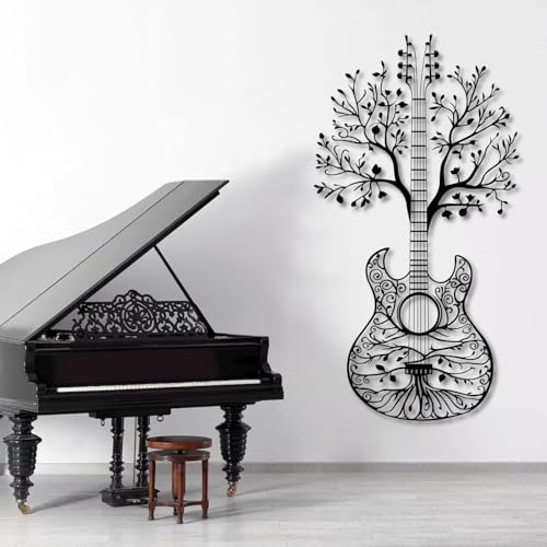 Tableau Mural en métal Noir représentant Une Guitare Arbre de Vie, décoration Murale inspirée par la Musique et la Nature, Sculpture Moderne représentant Une Guitare Arbre de Vie pour Le sal
