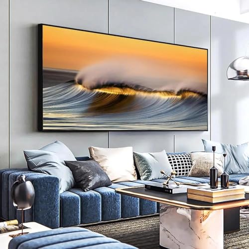 HYFBH Grand tableau mural pour salon, coucher de soleil moderne en bord de mer, plage naturelle, paysage, affiche imprimée, peinture sur toile, décor 65x130cm avec cadre noir