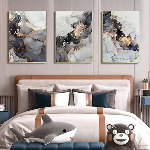 FSLEOVN Tableau mural pour salon moderne, lot de 3, noir, blanc, or, géométrique, sur toile, abstrait, marbre, décoration pour la maison, sans cadre (noir, or, 60 x 90 cm)