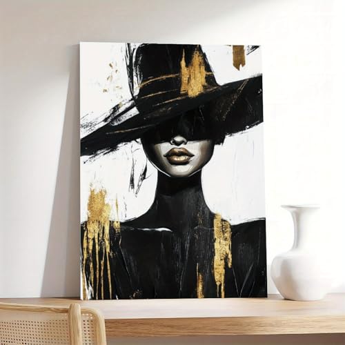 IXEHOH Tableau Toile Moderne Mode Noir et Or Femme au Chapeau Peinture Art Mural Vertical pour Salon Chambre Déco Chic Esthétique Art Mural Grand Tableau Toile Décoration Murale Tableaux 30x40