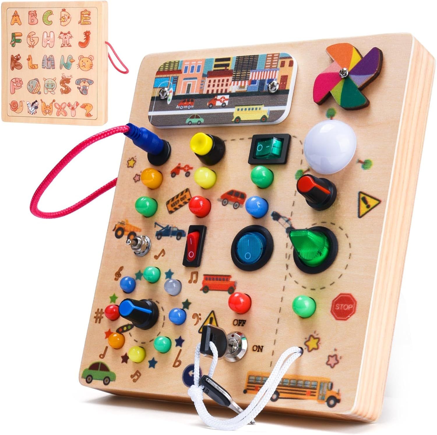 Tableau d'activités avec interrupteur lumineux LED - Jouet Montessori en bois - Jouet de voyage pour bébé - Tableau sensoriel - 1-5 ans - Educatif - Jeunes enfants dès 1 an - Enfants dès 1 an