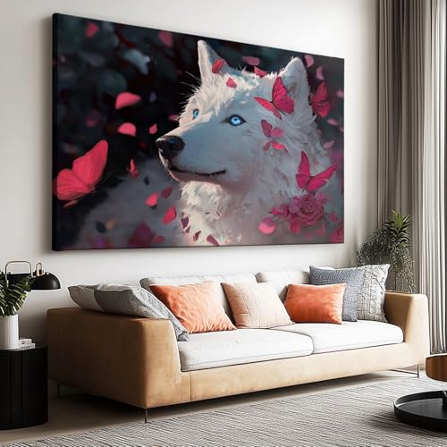 Générique Impression sur Toile avec Cadre Animaux Loups Papillons Pétales 120x60cm Tableau Décoration Murale Modern, Image Art Grand Tableaux Décoratifs pour Salon Chambre Salle de Bain