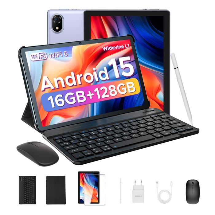 Tablette Android 15 10" 2 en 1 avec étui clavier, souris et stylet, 6 Go de RAM, 32 Go de ROM, 1 To, processeur quadricœur, WiFi, BT, écran HD 1280 x 800, 6000 mAh, double caméra, GMS, Widevine L1