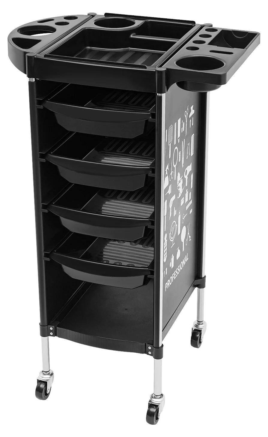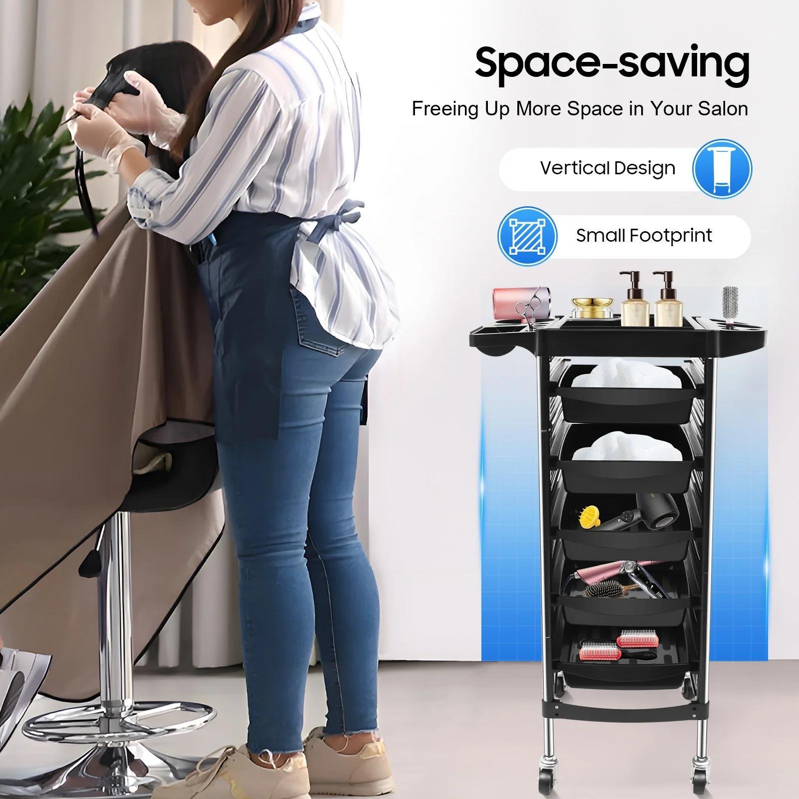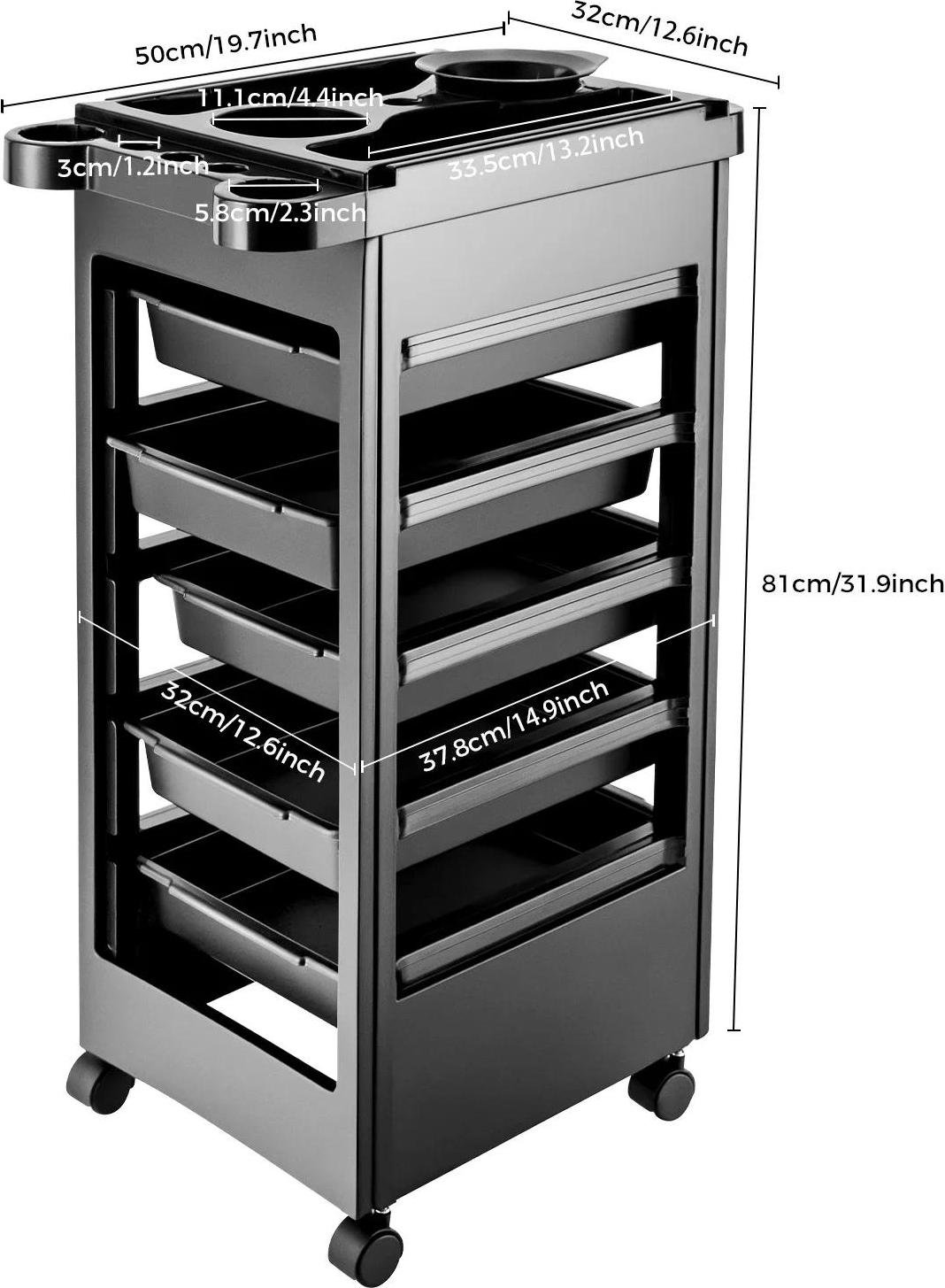 Chariot de coiffure noir avec 5 tiroirs, capacité de charge de 80 kg, roues pivotantes à 360° et tablette amovible - Matériau PP