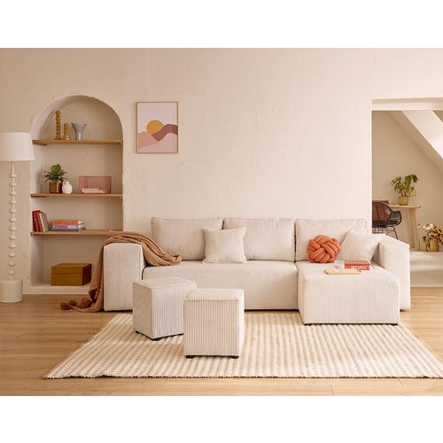 California - canapé d'angle réversible convertible - avec coffre, tablette et poufs - en velours côtelé - 4 places - beige beige Taille unique